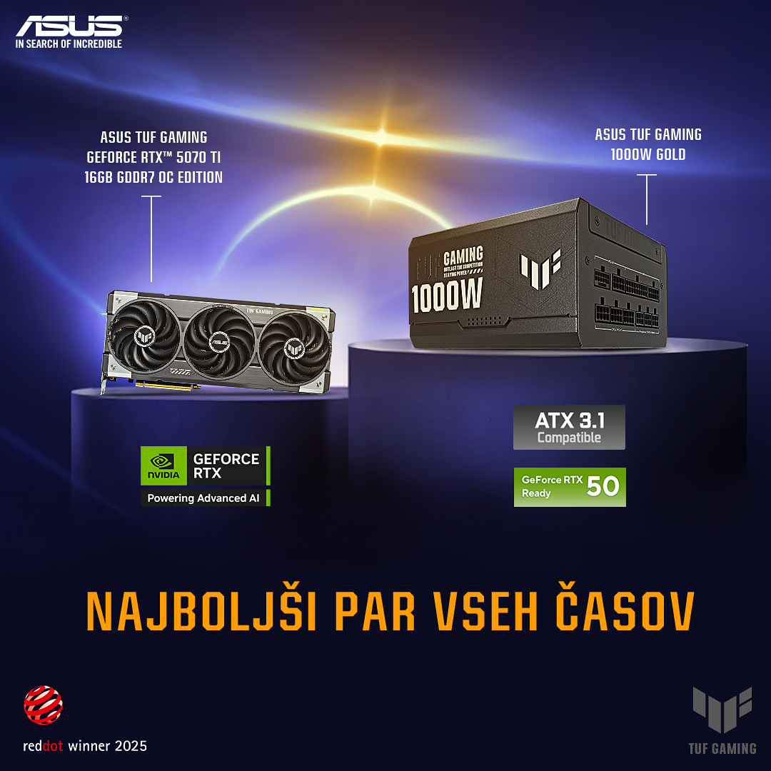 Omisli si svoj najboljši par vseh časov - grafično kartico ASUS TUF GeForce RTX 5070 Ti OC 16GB in napajalnik ASUS TUF Gaming 1000W ATX 3.0 Gold, na voljo tudi v beli barvi.